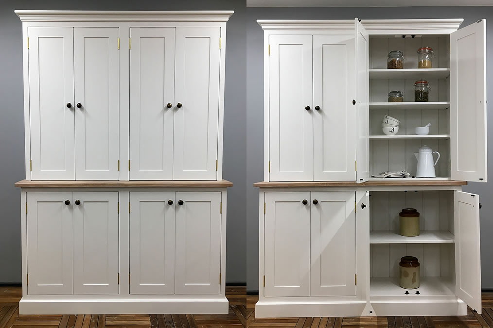 Freestanding larder cupboard/pantry constructed in two parts. The lower section is fitted with an oak worktop and would work on it's own as a sideboard. The addition of the upper cuboard more than doubles the storage capacity. Dimensions, colour and handles can all be adapted as required.