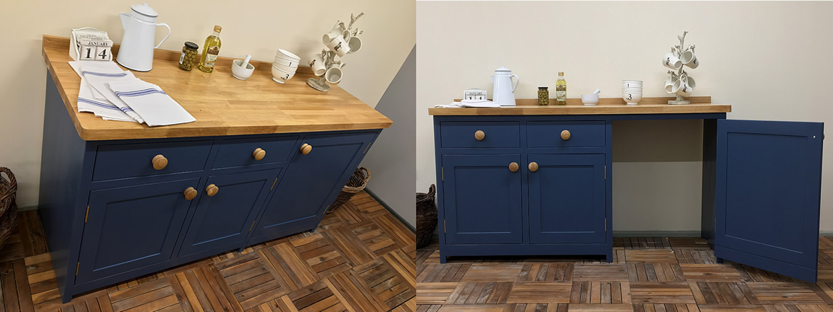 Built in two sections in order to facilitate ease of delivery. The lower section is fitted with an oak worktop and would work on it's own as a sideboard. The addition of the upper cuboard more than doubles the storage capacity. Dimensions, colour and handles can all be adapted as required.