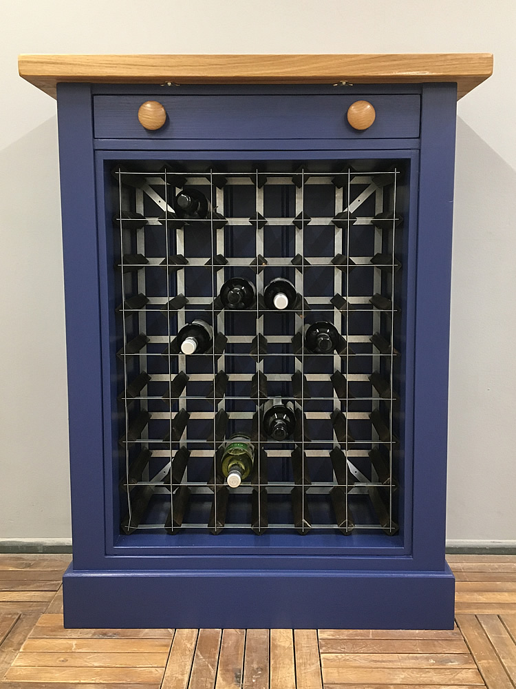 48 bottle capacity painted wine rack fitted with a 40mm thick oak worktop. Bottle capacity and dimensions can be adapted as required.