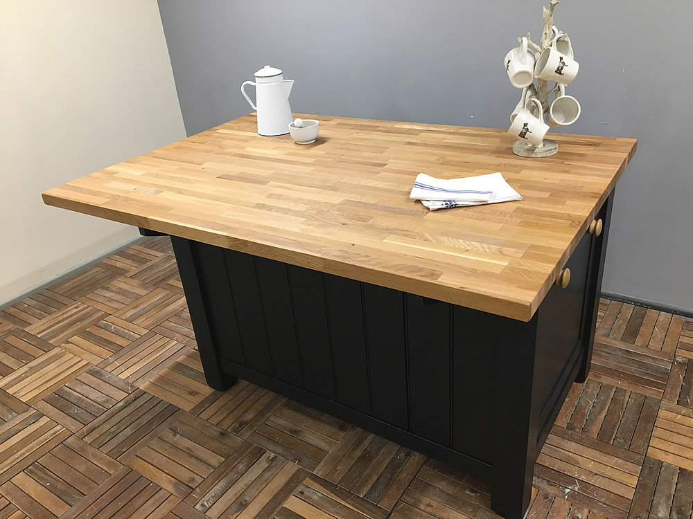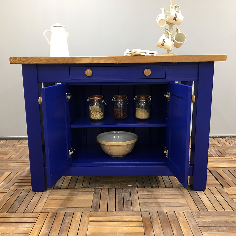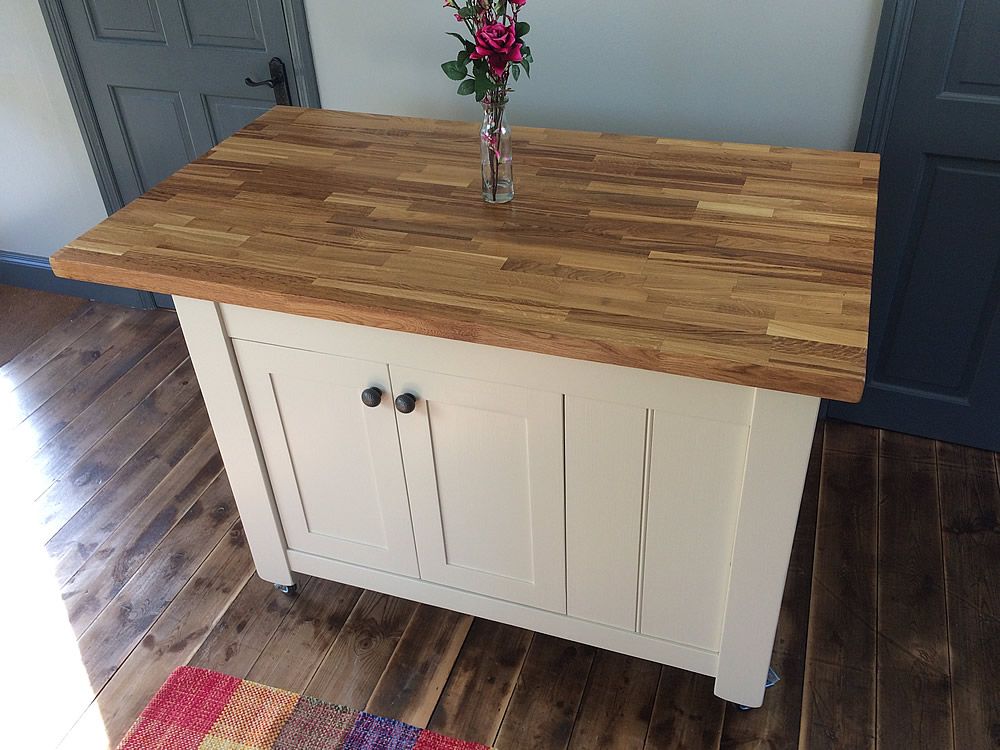 Small freestanding Kitchen Island with a double cupboard & Drawer. Price below includes a 40mm thick Oak Worktop but other timbers are available on request. Any size & Colour can be Made to Order. W:1300mm H:910mm D:650mm