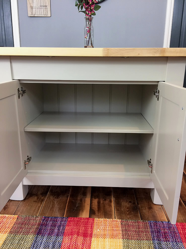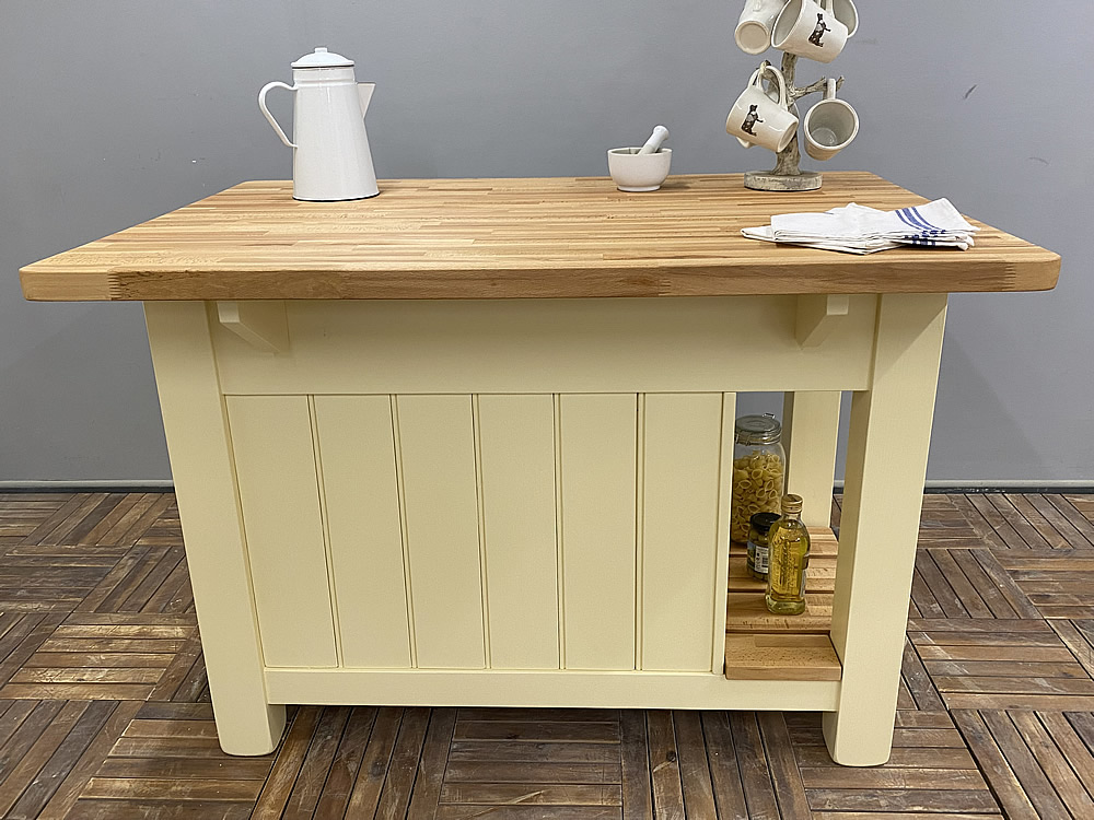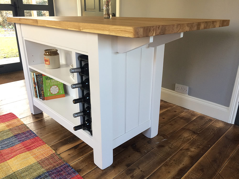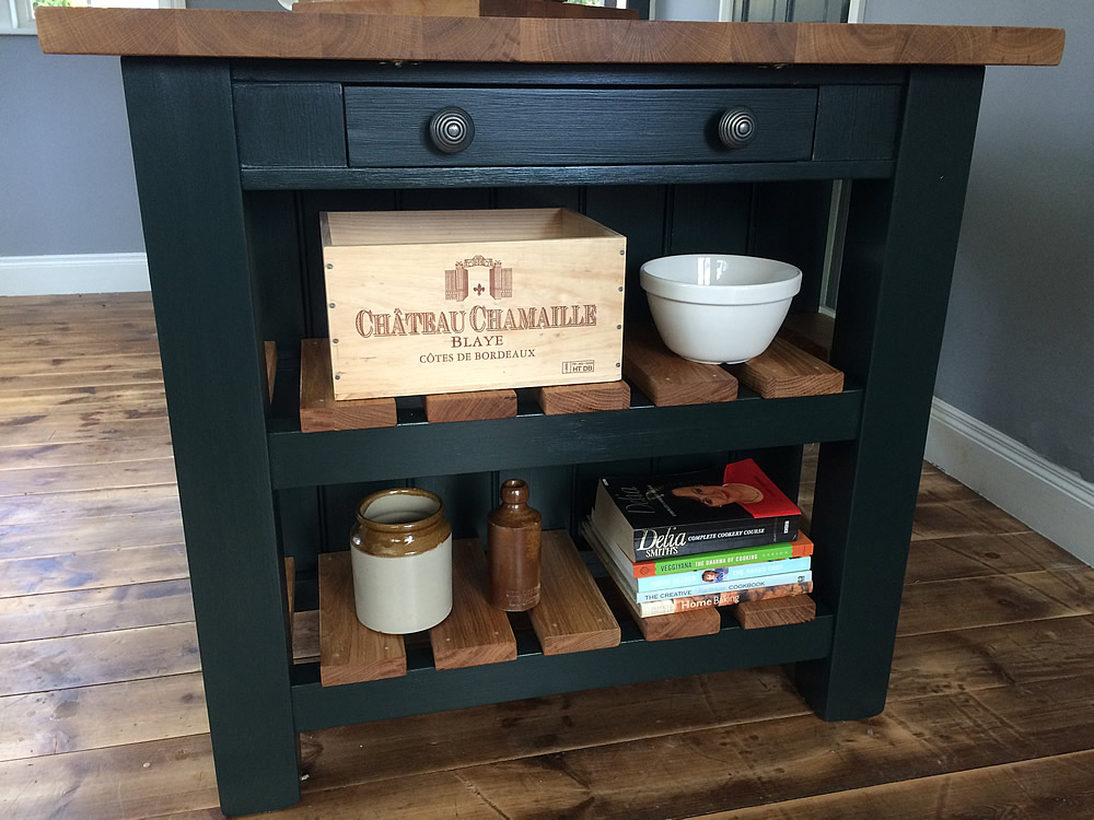 As all our freestanding islands are lovingly handmade & handpainted we are able to offer a totally bespoke service. So if you have a design in mind that isn't reflected on our islands page then please don't hesitate to contact us & discuss your individual design ideas. Each of our freestanding kitchen islands are unique & have been created & designed to suit each of our customer’s specific requirements. This allows for any combination of design features to be incorporated into any size of island that best suits the space that is available in your kitchen. Our freestanding kitchen islands can house cupboards & shelving, open slatted shelving, drawers & bookcases, even wicker baskets. The option of having an overhanging worktop turns your kitchen island into a breakfast bar & offers you a place to sit & utilize it as a table as well allowing your kitchen island to provide a more social function as well as a practical & stylish one.