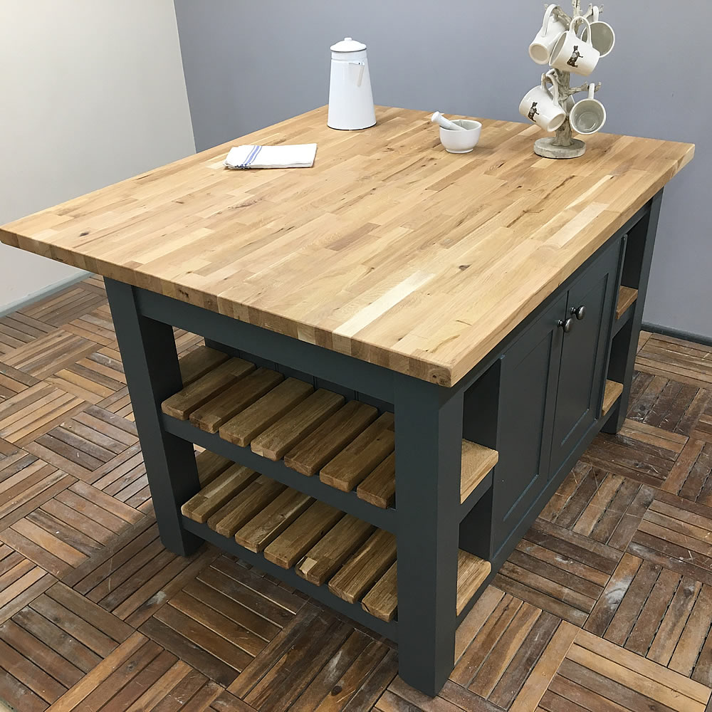 Large freestanding kitchen island shown painted in our own colour 'Gentle Willow'. Fitted with a 40mm thick staved oak worktop & incorporating two full-width slatted oak shelves. Price below includes the worktop as shown but a range of hardwood timbers are also available. Any size & Colour can be Made to Order. W:1800mm H:910mm D:1000mm