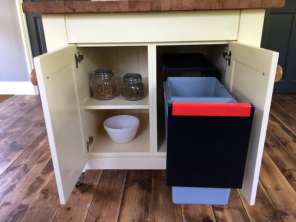 Freestanding Kitchen Island Incorporating Double Sided Cupboard, Tilting, Pull-Out Waste Bin & Small End Breakfast Bar. Shown Fitted with Optional Locking Castors. Price below includes a 40mm thick Oak Worktop. Any size & Colour can be Made to Order. Size Shown W:1400mm x H:950mm D:800mm