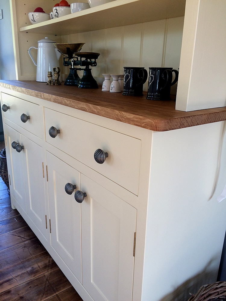 Large kitchen dresser with an open shelf top offering an ideal combination of storage & display. Made in any size & painted in the colour of your choosing. Waxed pine or oiled oak worktop options are available. Overall maximum dimensions H:2000 D:450mm - various widths & prices as shown in the 'Prices" or downloadable brochure/price list links below....